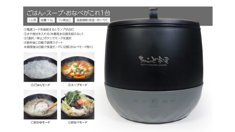 本製品は、少人数世帯や一人暮らしにぴったりな、使い勝手の良い2合炊きのマルチ炊飯器。「ごはん」「スープ」「おかゆ」「おなべ」の4モードを搭載しており、これ1台でさまざまメニューを楽しむことができるのだ。