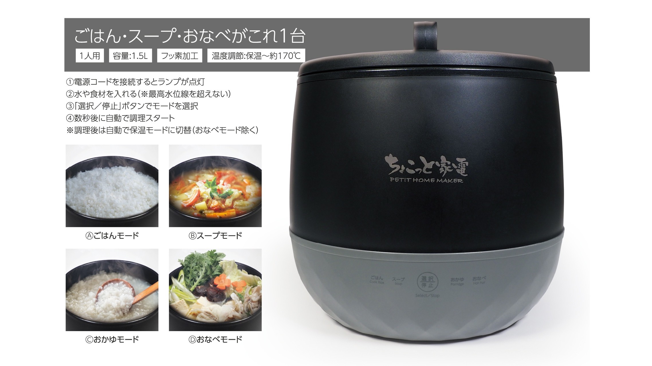 「ごはん」「スープ」「おかゆ」「おなべ」の4モードを搭載!