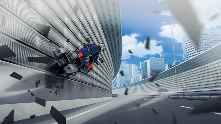 冒頭では千速が白バイで高速道路の壁を駆け上がるシーンも。白バイの重さでは不可能な動きも、自然でリアルに見えるように考え抜かれたうえで、想像を膨らませて描いている。千速のバイクに羽が生えたように見える、美しいジャンプシーンも必見だ。