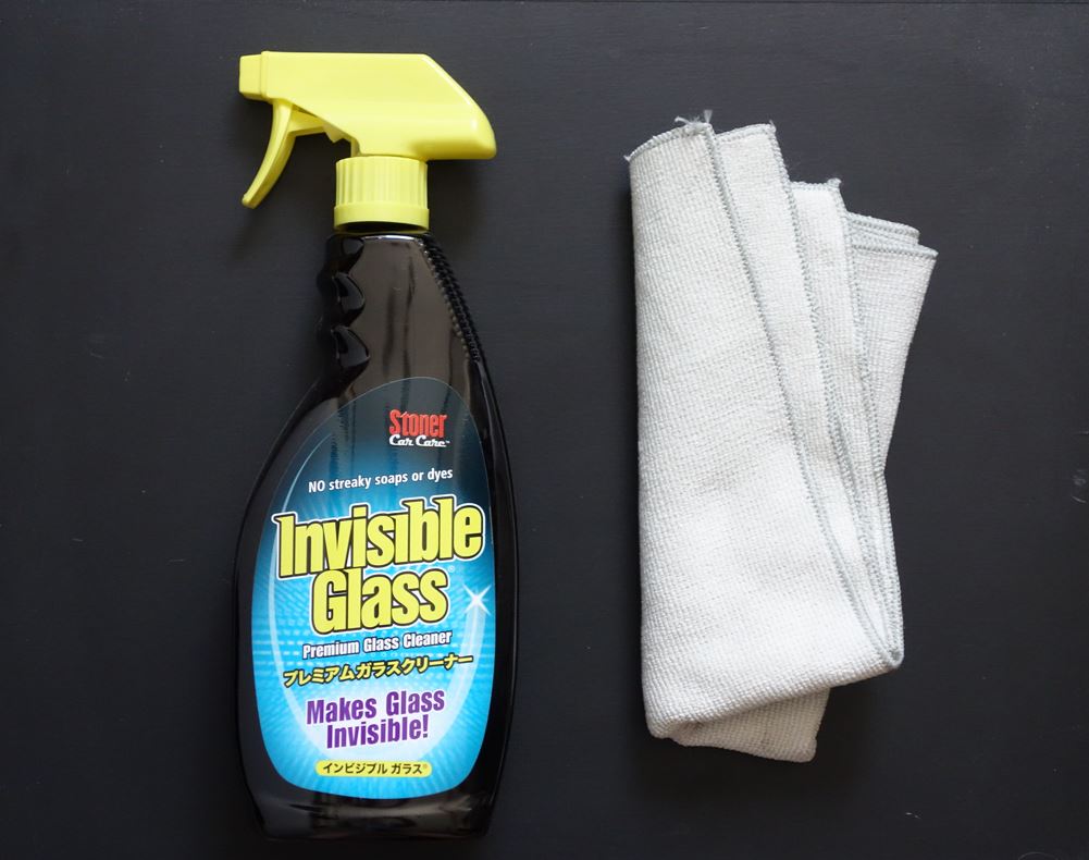 そこで、出発前の忙しい中でも、最低限、ウインドーのクリーニングを行いたい。最初に水で絞ったマイクロファイバークロスでフロントウインドー、ワイパー付きのリヤウインドーから拭き始め、サイドウインドーを含めたウインドー全体を下拭きする(ここがポイント)。それで大体の汚れを拭き取った後、クルマ専用のウインドークリーナーと2枚目の大き目で乾いたマイクロファイバークロスを使い、仕上げ拭きを行う。時間にしてクルマの大きさ、ウインドー面積にもよるが、10分もあれば済むはずだ。そして時短を追求するなら、拭きスジが残りにくく洗浄力が強力なガラスクリーナーが必須。筆者が長年愛用しているのはKURE プレミアムガラスクリーナー ストーナー インビジブルガラスを使っている。