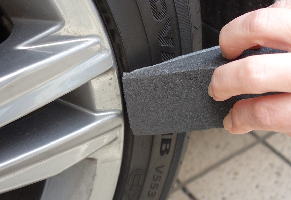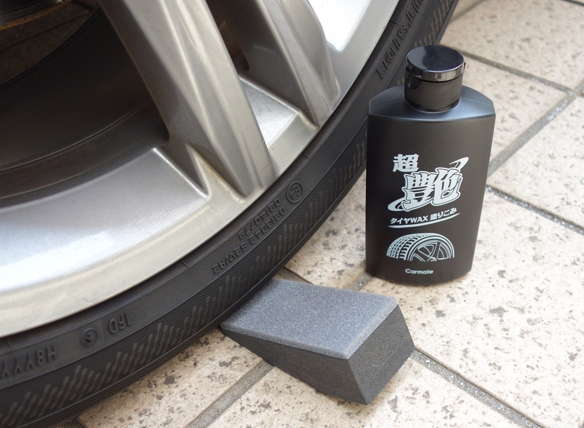 すでにタイヤは霧吹きの水(またはホースやケルヒャーなどの高圧洗浄機の水)で洗ってあるので、タイヤの仕上げはタイヤワックスがけである。