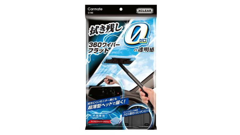 ここで、ウインドー外側をしっかりクリーニングしたにも関わらず、なんだか視界がすっきりしない・・・ということであれば、それはウインドー内側の汚れが原因だ。もしそれが気になるなら、そしてフロントウインドー下端が遠く、手が入りにくいなら、”オプション項目”としてカーメイトのC140 エクスクリア 360ワイパー フラットを使うといい。超薄型ヘッドと380mmのグリップによって、プリウスやミニバンなどの大きく傾斜し、大面積で、モニターがジャマになるフロントウインドーも楽々手が届くというわけだ。