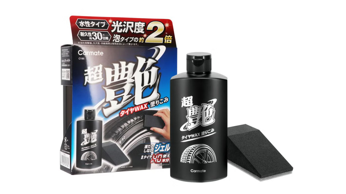 お薦めのタイヤワックスは、カーメイトのC195超艶タイヤワックスだ。タイヤにダメージを与えない水性であることはもちろん、泡タイプの約2倍の光沢度を持ち、耐久性は約30日間。しかも、タイヤワックスとしてはめずらしい透明のジェル状ワックスをスポンジに付けて塗布するためタレにくく(タイヤワックスがホイールを汚さない)、ジェルがタイヤに密着しやすいのもポイント。また、角度付きスポンジが付属し、地面と接触したタイヤ側面にもワックスがけができ、ホイールのリム周りとの境目にもしっかりワックスが届くから塗り込みやすさは文句なし。ゆえに作業もスピーディに行えるというわけだ。