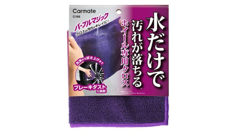 タイヤはタイヤ専用に用意したマイクロファイバークロスで水気を拭きとればいいのだが、汚れがひどいホイールを拭き上げるとブレーキダストなどのしつこい汚れが付着し、洗っても落ちないという悲劇に。そこで重宝するのがカーメイトの新商品、C196パープルマジック ホイール専用クロスだ。