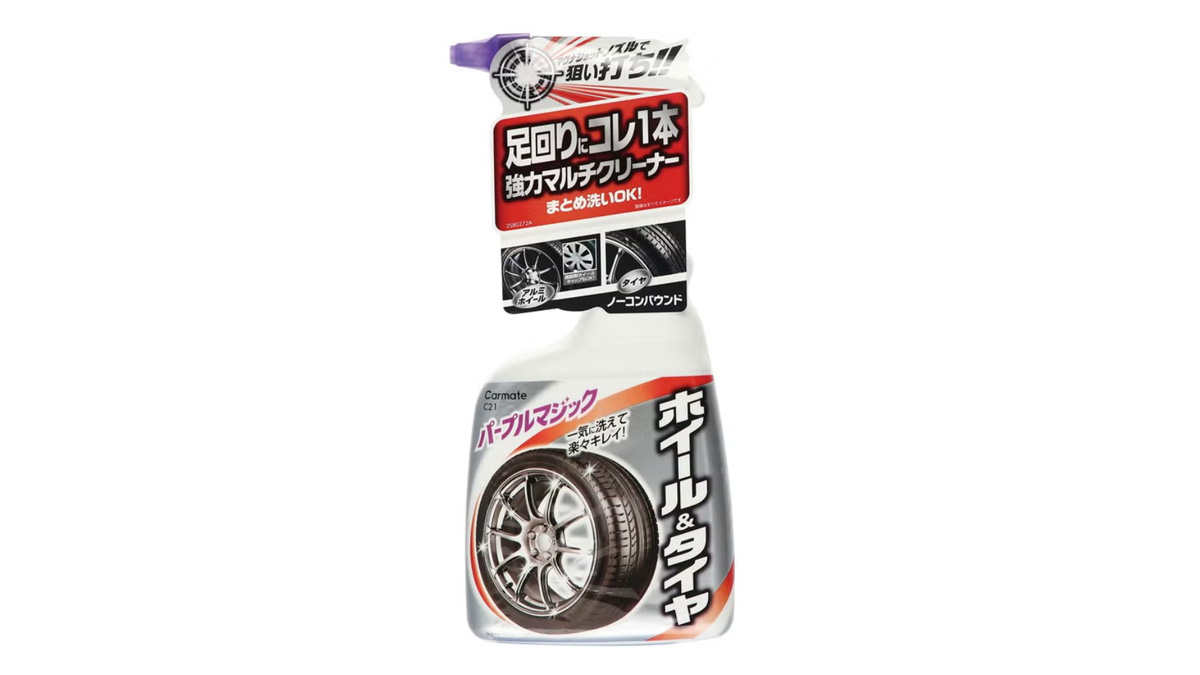合わせて、ホイールに付着したブレーキダストや油汚れ、タイヤの汚れを同時かつ、強力に洗浄してくれるカーメイトのC21 マルチホイールクリーナー・マグナショットを使えば、タイヤとホイールを同時に洗浄することができ、2~3分放置した後、パープルマジック ホイールスポンジシリーズで汚れを落とし、水で洗い流せばいい。この方法も時短タイヤ&ホイール洗浄に効果的だ。
