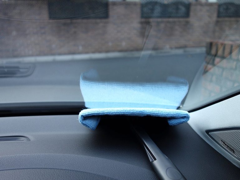 ウインドークリーニングを終えたら、いったん、運転席に座り、とくにフロントウインドーの視界、拭きスジの有無を確認。気になるスジ、拭きムラがあったら、2枚目のマイクロファイバークロスで処理したい。視界がクリアだと、運転、ドライブもスッキリした気分で行えることになる。ウインドー外側のクリーニングで用意するのはマイクロファイバークロス2枚、ガラスクリーナーの3点だけである。