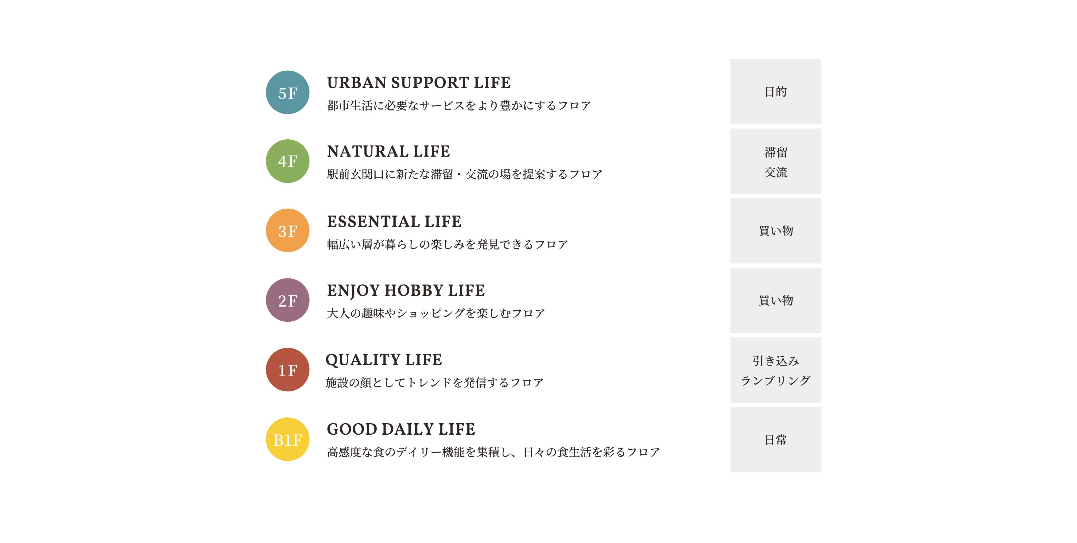 フロアは地上5階、地下1階で構成され、商業施設初、新業態、自由が丘の歴史ある名店など、食やトレンド、ファッション、暮らしの楽しみを発見できる多様な店舗が揃う。