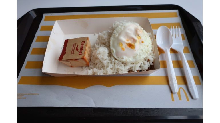 マクドナルドのナシ・ルマ(Nasi Lemak McD)には、3つの種類がある。もっとも基本的なのは、たまごとイカン・ビリスの組み合わせ(7.08マレーシア・リンギ/以下RM、約285円)である。
