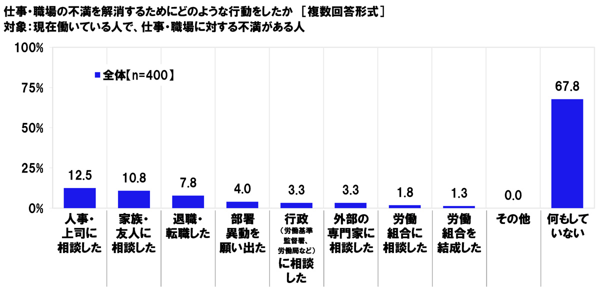 現在働いている人で、仕事・職場に対する不満がある人(400名)に、仕事・職場の不満を解消するためにどのような行動をしたか聞いたところ、「人事・上司に相談した」は12.5%、「家族・友人に相談した」は10.8%、「退職・転職した」は7.8%、「部署異動を願い出た」は4.0%、「行政(労働基準監督署、労働局など)に相談した」と「外部の専門家に相談した」は3.3%、「労働組合に相談した」は1.8%と、いずれも低い割合にとどまった。他方、「何もしていない」は67.8%となり、不満を感じている人の大多数は特に行動せず不満を抱えたままのようだ。