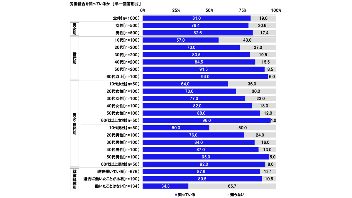 ■「労働組合を知っている」81.0%、10代では57.0%にとどまる