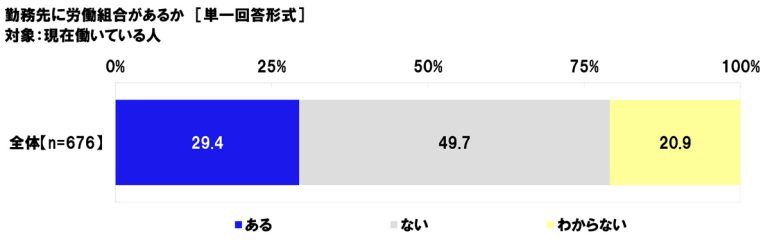 現在働いている人(676名)に、勤務先に労働組合があるか聞いたところ、「ある」は29.4%、「ない」は49.7%、「わからない」は20.9%となった。