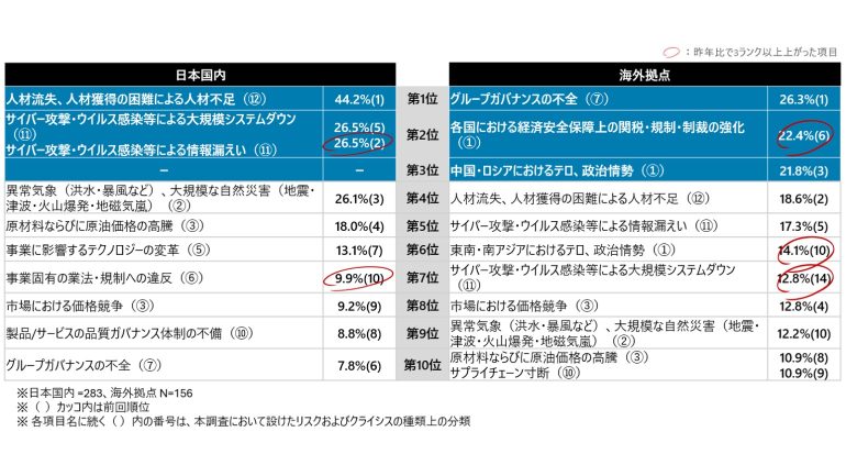 一方、海外拠点では1 位「グループガバナンスの不全」、2位「各国における経済安全保障上の関税・規制・制裁の強化」、3位「中国・ロシアにおけるテロ・政治情勢」という結果が得られた(図表1)。