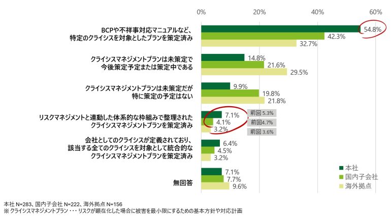 一方で「リスクマネジメントと連動した体系的な枠組みで整理されたクライシスマネジメントプランを策定済み」と答えた企業は本社では7.1%(前回5.3%)、国内子会社4.1%(前回4.7%)、海外拠点3.2%(前回3.6%)と前回から微増も、依然として低い結果に。