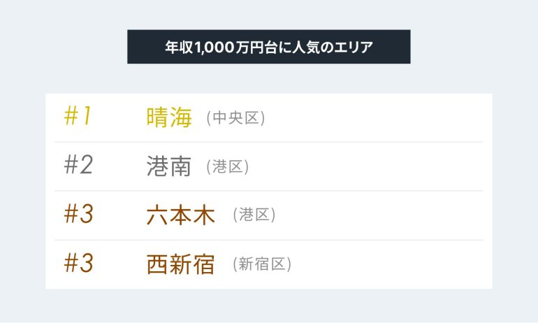 「晴海」や「西新宿」が共通して上位にランクインする一方、2,000万円超では「赤坂」「神宮前」が同率1位となるなど、高年収帯特有の居住傾向が顕著に現れた。