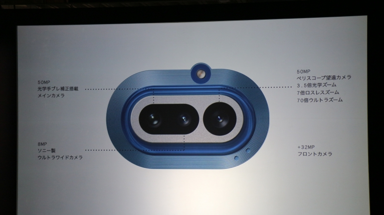 アウトカメラは5000万画素メイン、800万画素超広角カメラ、5000万画素望遠の3眼構成。光学ズームは3.5倍のペリスコープ望遠となっており、デジタルズームは驚異の140倍に対応する。