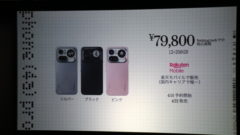 Nothing Phone(4a)Proは、日本向けに初めて展開されるProモデル。Nothingシリーズ内では、ミッドハイと言える立ち位置になるだろう。直販ストアでの価格は7万9800円であるほか、楽天モバイルでも取り扱われる。