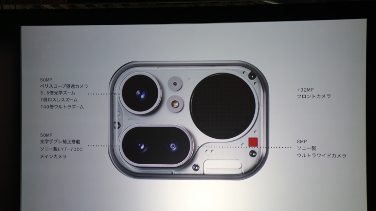 背面デザインはスケルトンデザインをあえてカメラ付近の一部に採用。アルミボディとスケルトン部分のコントラストがユニークなデザインとなる。カメラ横には、163個のLEDライトを搭載した「Glyphマトリックス」が搭載されている。