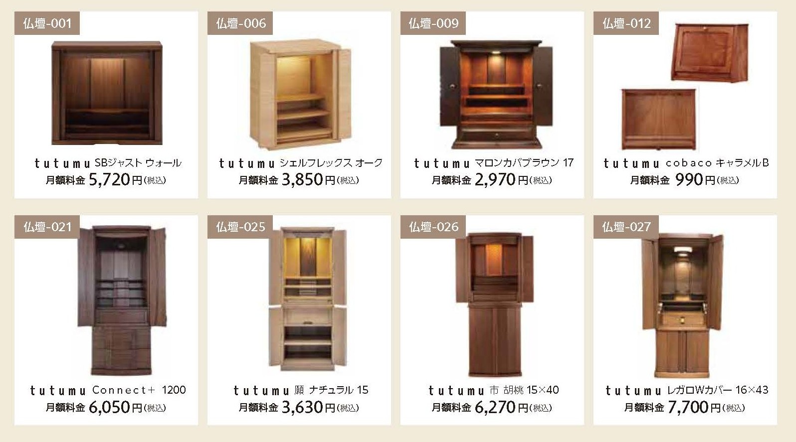 対象商品は、現代の住環境やライフスタイルに配慮したコンパクト、かつモダンなデザインの仏壇を中心に35種類をラインアップ。また、仏壇とともに下台や仏具セットも豊富に取り揃え、月額605円(税込)から利用できる。