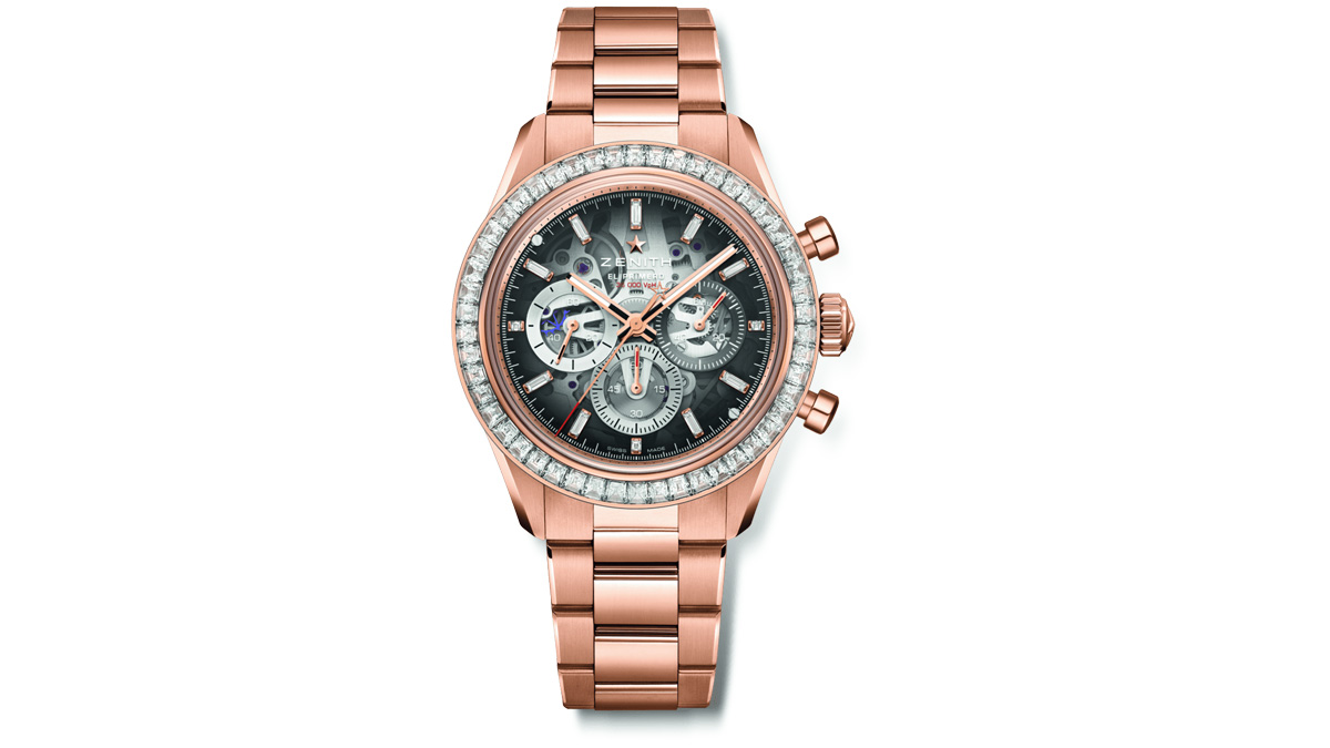 22.3130.3600/01.M3100 / エル・プリメロ 3600 SK 自動巻 / パワーリザーブ 約60時間 / 18Kローズゴールド / ケース径 41 mm / バゲットカットダイヤモンド 52ピース(VVS)約5カラット /カラーサファイア文字盤 / 3色カンター / 10気圧防水 / 14,927,000円(税込予価)/ 限定10本
