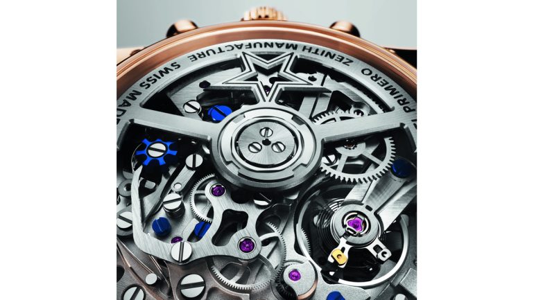 ゼニススターが刻まれたオープンワークのローターは、巻き上げ効率と機構のバランスを維持しながら、スケルトンの魅力を最大限に高めている。