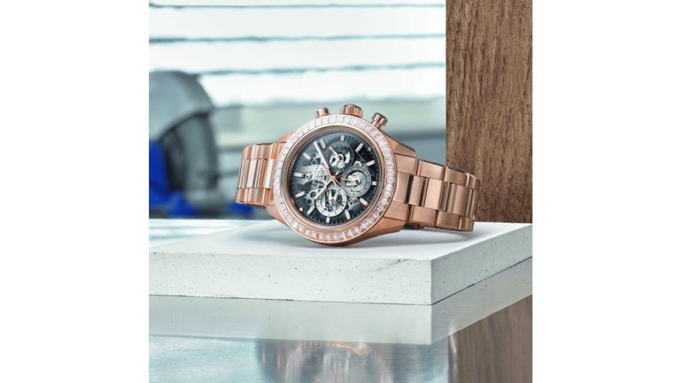 そしてコレクションを締めくくるのは、ローズゴールド製ケースにゴールドブレスレットを備え、ベゼルに50ピースのバゲットカットのダイヤモンドをセットした限定生産10本のモデルだ。