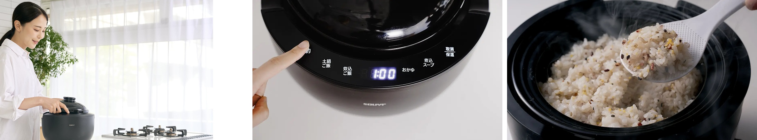 そんな本製品は、テフロンやフッ素といった化学コーティングを使用せず、安全性に配慮したセラミック加工を施した本格的な土鍋を採用しているのが特徴で、360度熱を伝えやすい構造かつ二重蓋設計により、旨みや香りを引き出しやすくふっくらとした炊き上がりを実現。お米本来の甘みや香りを引き立てる“土鍋炊き”の魅力を、日常の中で手軽かつ安心して楽しむことができる。