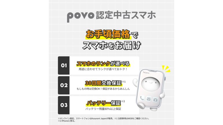 スマートフォン端末の高機能化や端末価格の上昇で中古スマホに対する関心が高まっているが、KDDI、沖縄セルラー、KDDI Digital LifeとAssurant Japanは2026年4月20日から中古スマホの需要に対応するために『povo 認定中古スマホ』の提供を開始した。