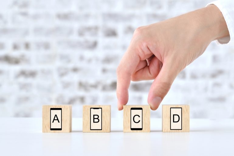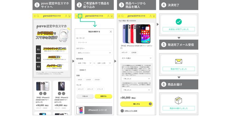 『povo 認定中古スマホ』は、すべて『povo』対応端末でバッテリー残量80%以上を保証(『iPhone』に限る)し、購入後30日間の無償保証も付属する。端末は状態に応じてA(美品)/B(良品)/C(可)の3段階のランクから選択できる。購入は、専用の販売サイトから行う。