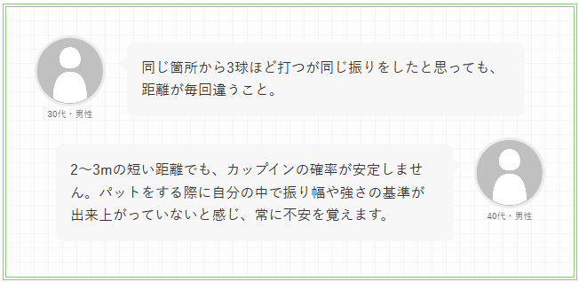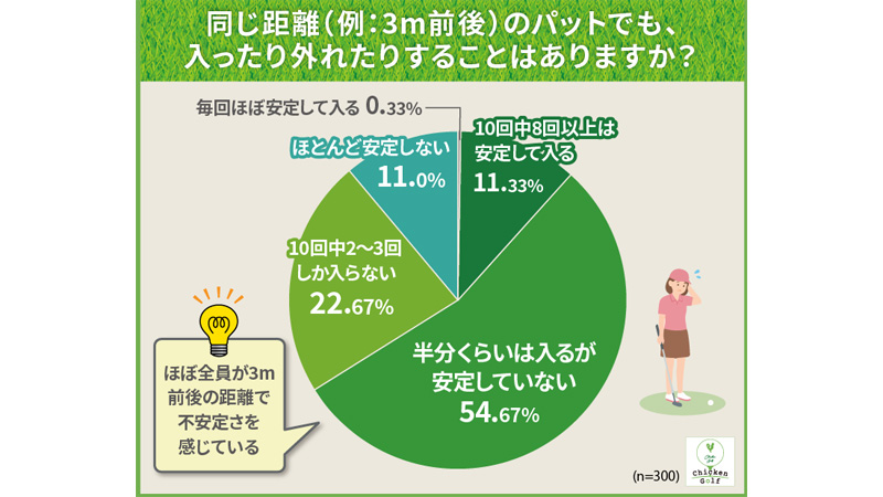 同じ距離(例:3m前後)のパットでも安定して入るかどうかを調査したところ、約9割のゴルファーがパットの安定性に課題を感じていることがわかった。