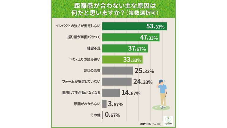 距離感が合わない主な原因について複数回答で調査したところ、「インパクトの強さが安定しない」が53.3%で最多となった。