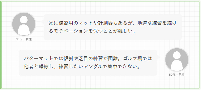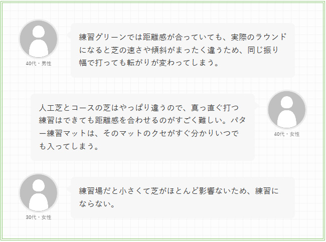 パター練習マットや練習グリーンでは一定の距離感を掴めても、実際のコースとは条件が大きく異なるため、練習の効果を実感しにくいと感じているゴルファーが多いことがわかる。