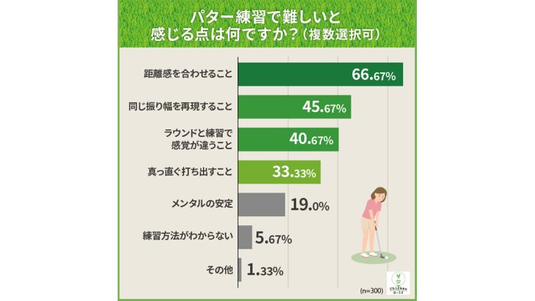 パター練習で難しいと感じる点について調査したところ、「距離感を合わせること」が66.7%で最多となった。