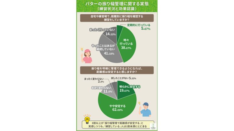 さらに、8割超が「振り幅を管理できれば安定する」と認識しているにもかかわらず、定期的に振り幅練習を実践できている人はわずか約6%という現実も明らかになっている。