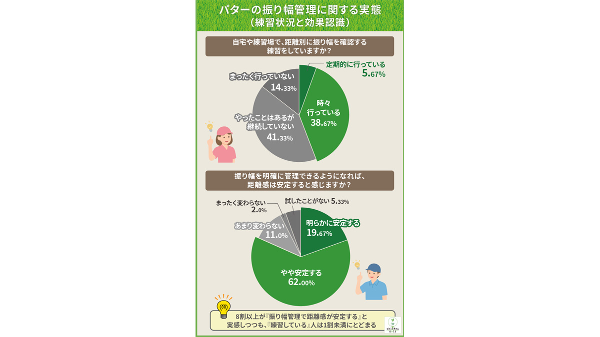 この結果から、パターの距離感改善には振り幅の基準を持つことが有効であると多くのゴルファーが認識している一方で、一人で正しい練習を継続する難しさが大きな障壁になっていることが明らかになった。