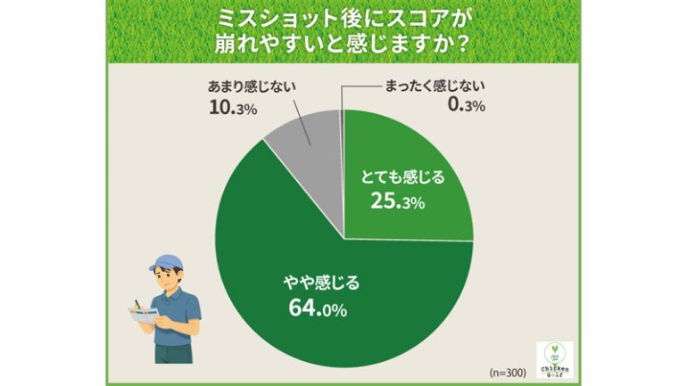 「あまり感じない」が10.3%、「まったく感じない」が0.3%にとどまり、ミスショット後のプレーがスコアに影響すると実感しているゴルファーが大多数であることが明らかになっている。