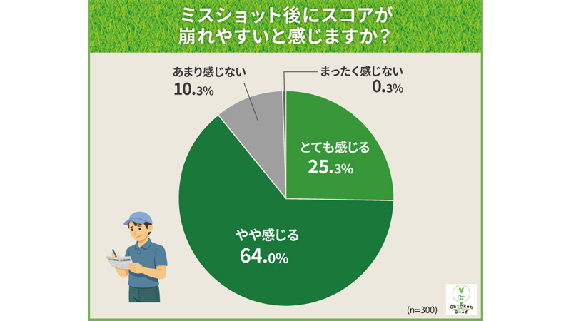 ミスショット後にスコアが崩れやすいと感じるかについては、「とても感じる」:25.3%、「やや感じる」:64.0%となり、89.3%のゴルファーがミスショット後にスコアが崩れやすいと感じていることがわかった。
