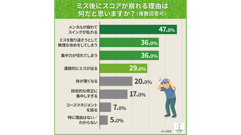 ミスショット後にスコアが崩れる理由として最も多く挙げられたのは、「メンタルが崩れてスイングが乱れる」で47.0%となった。