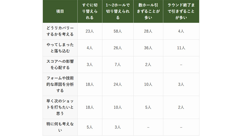 また、ミスを引きずる傾向が強いゴルファーほど落ち込むことが多い一方で、比較的早く切り替えられるゴルファーでは「どうリカバリーするかを考える」といった前向きな思考が多く見られた。
