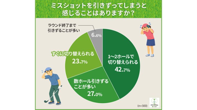 ミスショットをどの程度引きずるかについては、「数ホール引きずることが多い」が27.0%、「ラウンド終了まで引きずることが多い」が6.6%と、33.6%のゴルファーがミスショットを数ホール以上引きずる傾向があることがわかった。