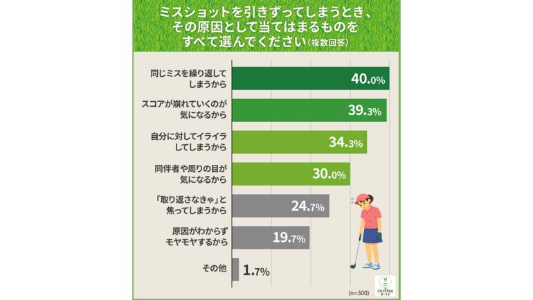 ミスショットを引きずってしまう原因で最も多かったのは「同じミスを繰り返してしまう」が40%となった。以下「スコアが崩れていくのが気になるから」が39.3%、「自分に対してイライラしてしまうから」が34.3%と続いた。