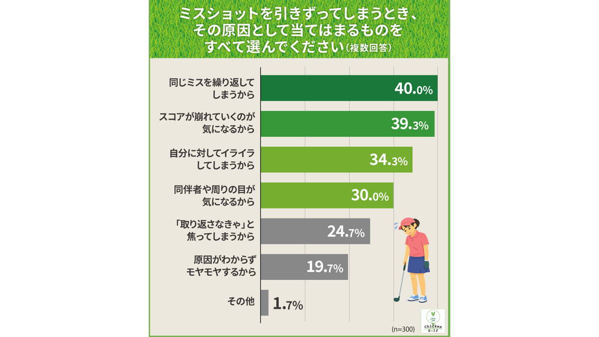 パーソナルゴルフレッスン「チキンゴルフ」を展開するクリアはこのほど、運営メディア「ゴルフの学び舎」にて、ゴルフ経験者300人を対象に「ミスショット後の行動と心理」に関するアンケート調査を実施し、その結果を発表した。