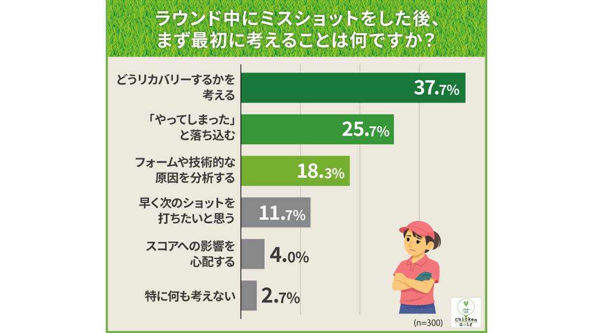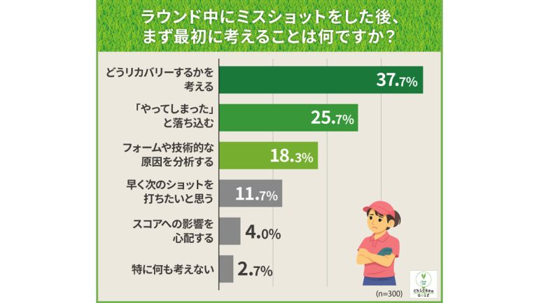 ラウンド中にミスショットをした直後にまず考えることとして、最も多かった回答は「どうリカバリーするかを考える」で37.7%となった。