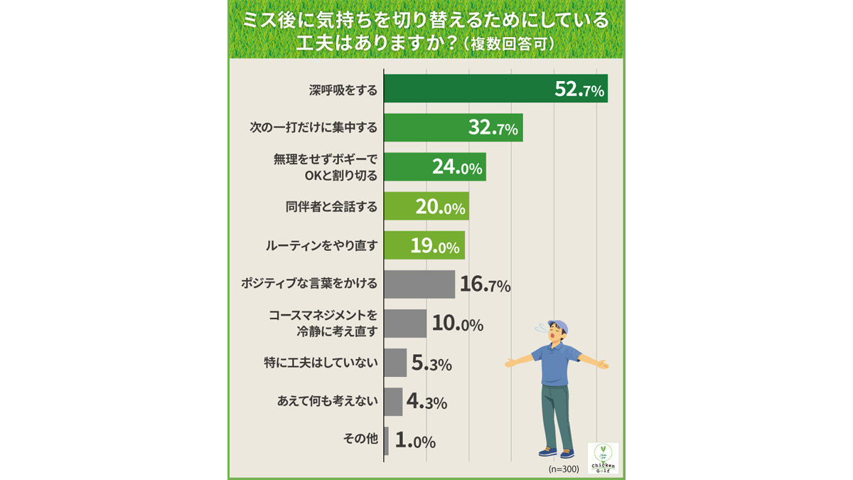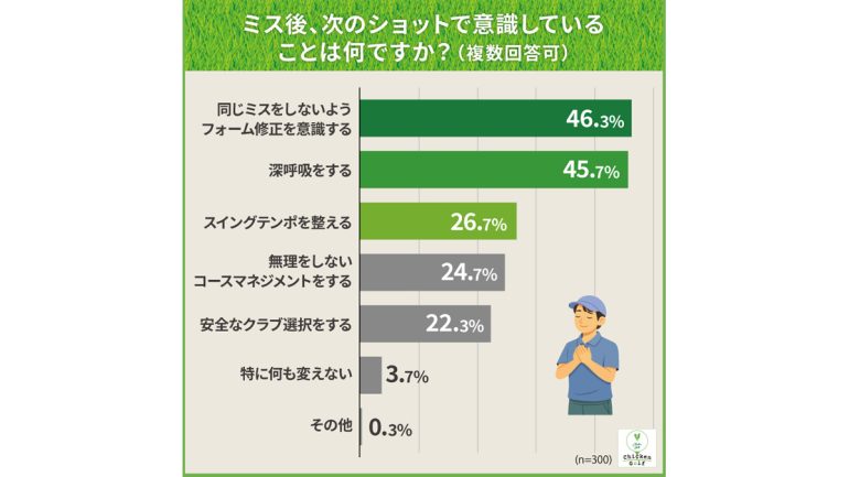 また、「無理をしないコースマネジメントをする」が24.7%、「安全なクラブ選択をする」が22.3%といった回答も見られ、ミスの後は無理な攻めを避け、堅実なプレーに切り替えるゴルファーも一定数いることが明らかになった。