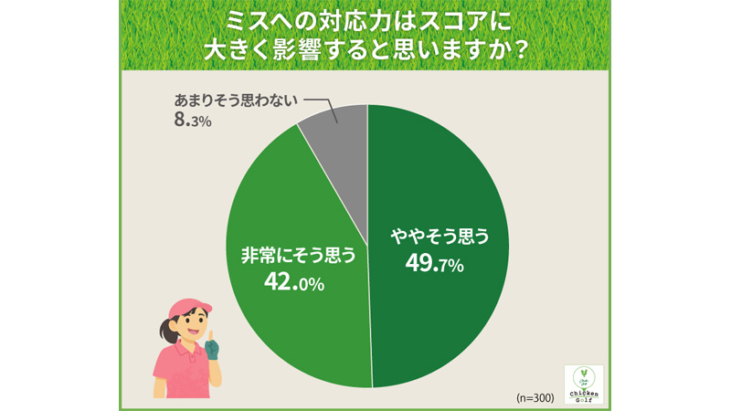 ミスへの対応力がスコアにどの程度影響するかについては、「非常にそう思う」が42.0%、「ややそう思う」が49.7%となり、91.7%のゴルファーがミスへの対応力はスコアに大きく影響すると感じていることがわかった。