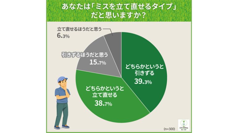 一方で、「どちらかというと引きずる」(39.3%)と「引きずるほうだと思う」(15.7%)を合わせると、55.0%のゴルファーがミスを引きずるタイプだと認識していることがわかった。