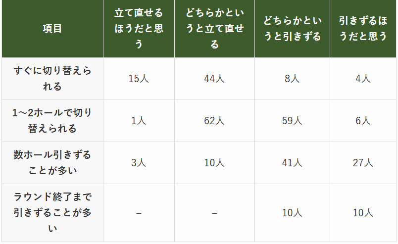 この結果から、ミスショットよりも、その後に同じミスが続くことやスコアへの不安などが気持ちを引きずる要因になっている可能性がうかがえる。
