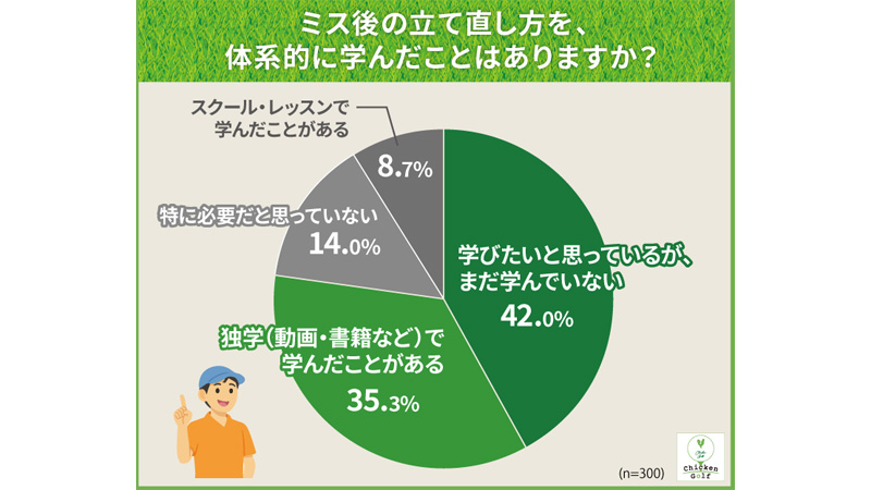 また、ミス後の立て直し方をレッスンなどで体系的に学んだ経験があるゴルファーは少なく、多くの人が自己流で対応している状況もうかがえる。
