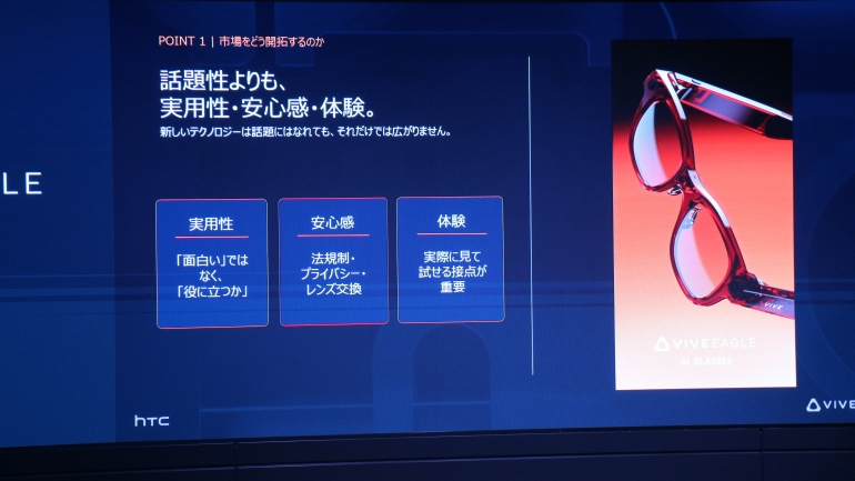 2026年4月21日、HTC NIPPON株式会社は新製品発表会を開催し、AIテクノロジーを日常生活の中に自然に溶け込ませることを目指したAIグラス「VIVE Eagle(バイブ イーグル)」を発表した。