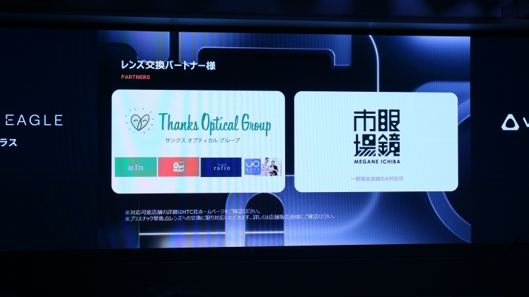 日常使いの「メガネ」として機能するためには、視力矯正のニーズに応えることが必須である。HTCとKDDIは、サンクスオプティカルグループや眼鏡市場といった大手のメガネ専門店とパートナーシップを締結。これにより、購入したVIVE Eagleを対応する一部の限定店舗に持ち込むことで、ユーザー自身の視力に合わせた度付きレンズへの交換がスムーズに行える体制が整えられている。