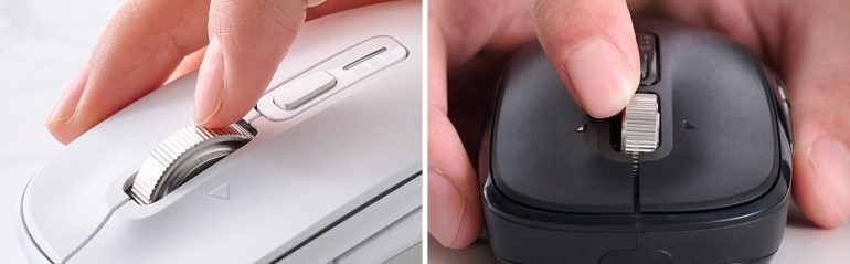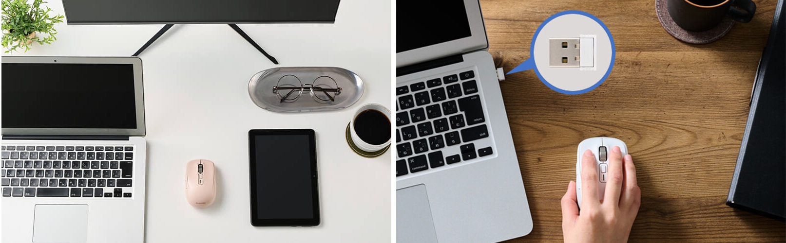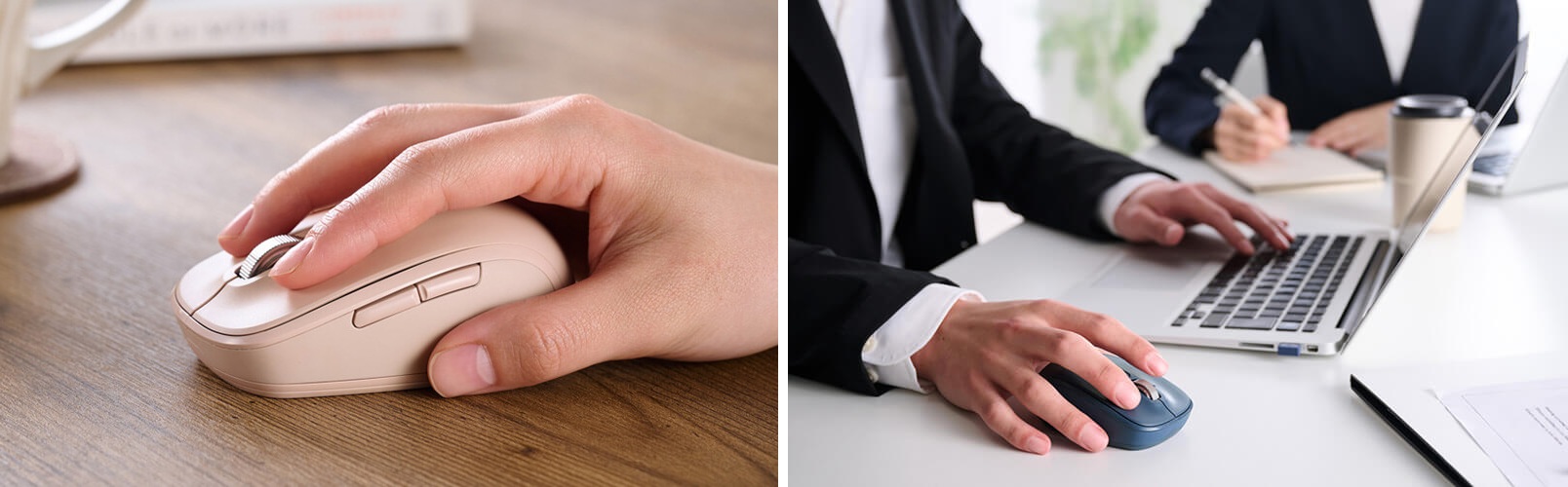このほか、利き手や持ち方を問わない左右対称の楕円形デザインを採用し、長時間作業でも快適な握り心地を追求。小さい凹凸やホコリがある環境でも正確にポインターを動かせるBlueLEDセンサーも搭載し、木材・樹脂・ガラス製のデスクや、ノート、テーブルクロスの上などでも快適に操作できる。
